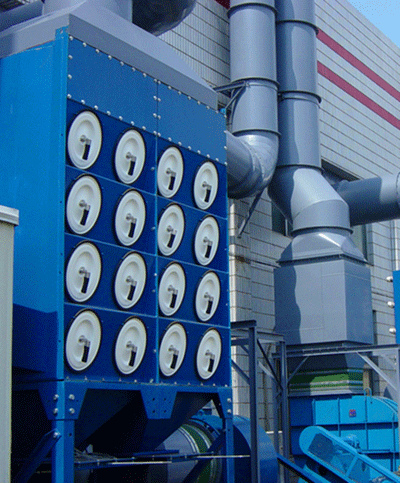在離心風(fēng)機(jī)的負(fù)壓作用下,粉塵從排氣口進(jìn)入后,通過風(fēng)管集中后進(jìn)入粉塵凈化器,在擋風(fēng)板的作用下,氣流向上流動(dòng),流速降低,部分大顆粒粉塵由于慣性力的作用被分離出來落入灰斗。細(xì)粉塵進(jìn)入凈化室,當(dāng)通過專用粉塵防靜電聚脂纖維濾芯時(shí),粉塵被阻留在濾筒的外表面,凈化后的氣體經(jīng)濾筒口進(jìn)入上箱體,從風(fēng)機(jī)出風(fēng)口排出。