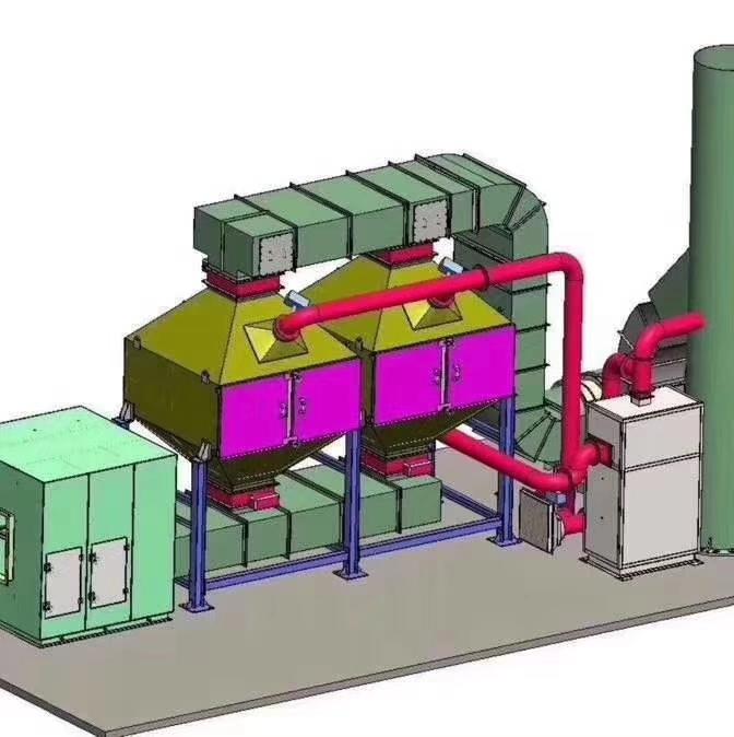催化燃燒裝置(RCO):首先通過除塵阻火系統(tǒng)。然后進(jìn)入換熱器,再送到加熱室,使氣體達(dá)到燃燒反應(yīng)溫度,再通過催化床的作用,使有機(jī)廢氣分解成二氧化碳和水,再進(jìn)入換熱器與低溫氣體進(jìn)行熱交換,使進(jìn)入的氣體溫度升高達(dá)到反應(yīng)溫度。如達(dá)不到反應(yīng)溫度,加熱系統(tǒng)科通過自控系統(tǒng)實(shí)現(xiàn)補(bǔ)償加熱。利用催化劑做中間體,使有機(jī)氣體在較低的溫度下,變成無害的水和二氧化碳?xì)怏w